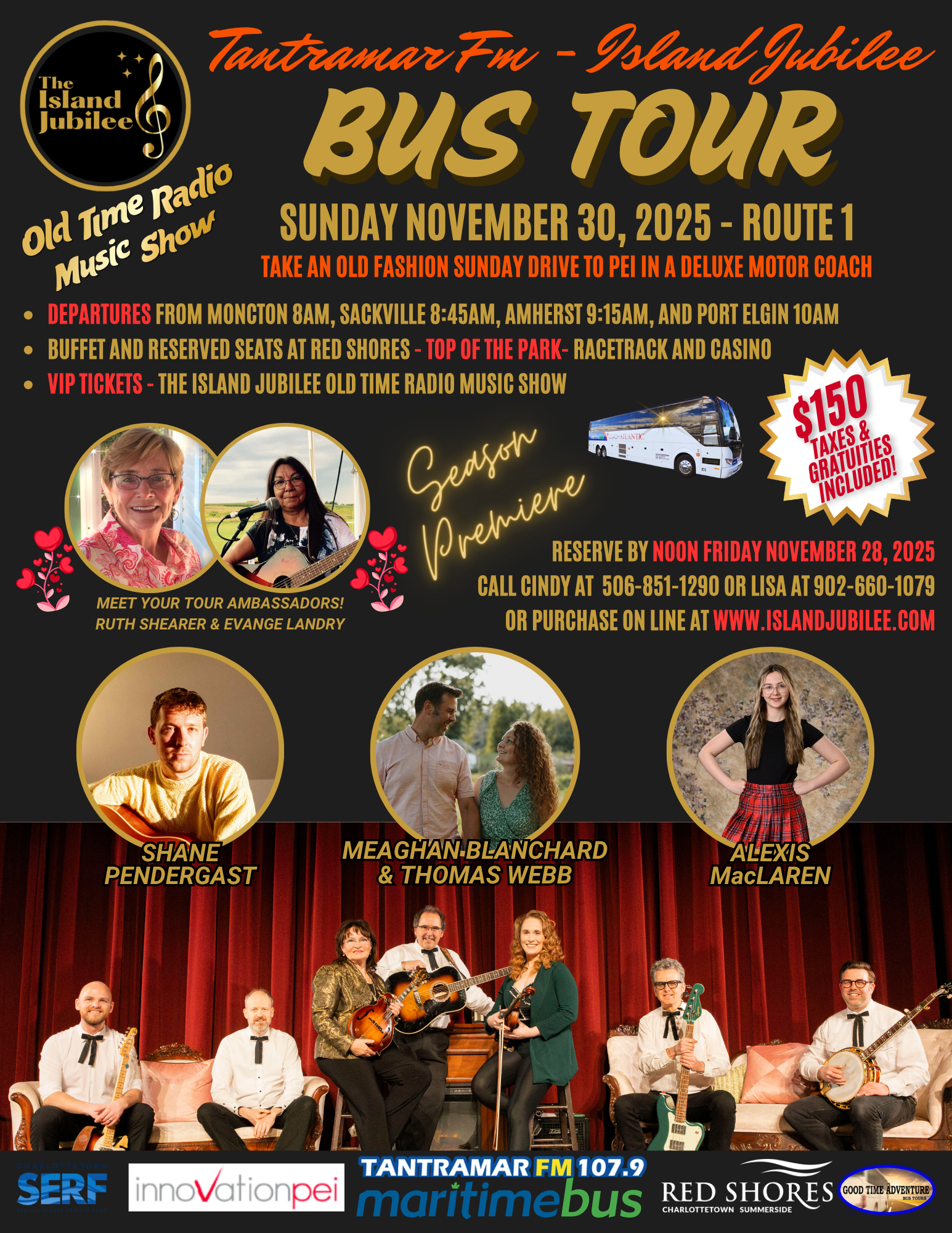 Tantramar FM - Island Jubilee SUNDAY DRIVE Bus Tour: Route 1 Tantramar Trail Departing Moncton/Amherst to Charlottetown PEI - Day Charter - Sunday November 30, 2025
