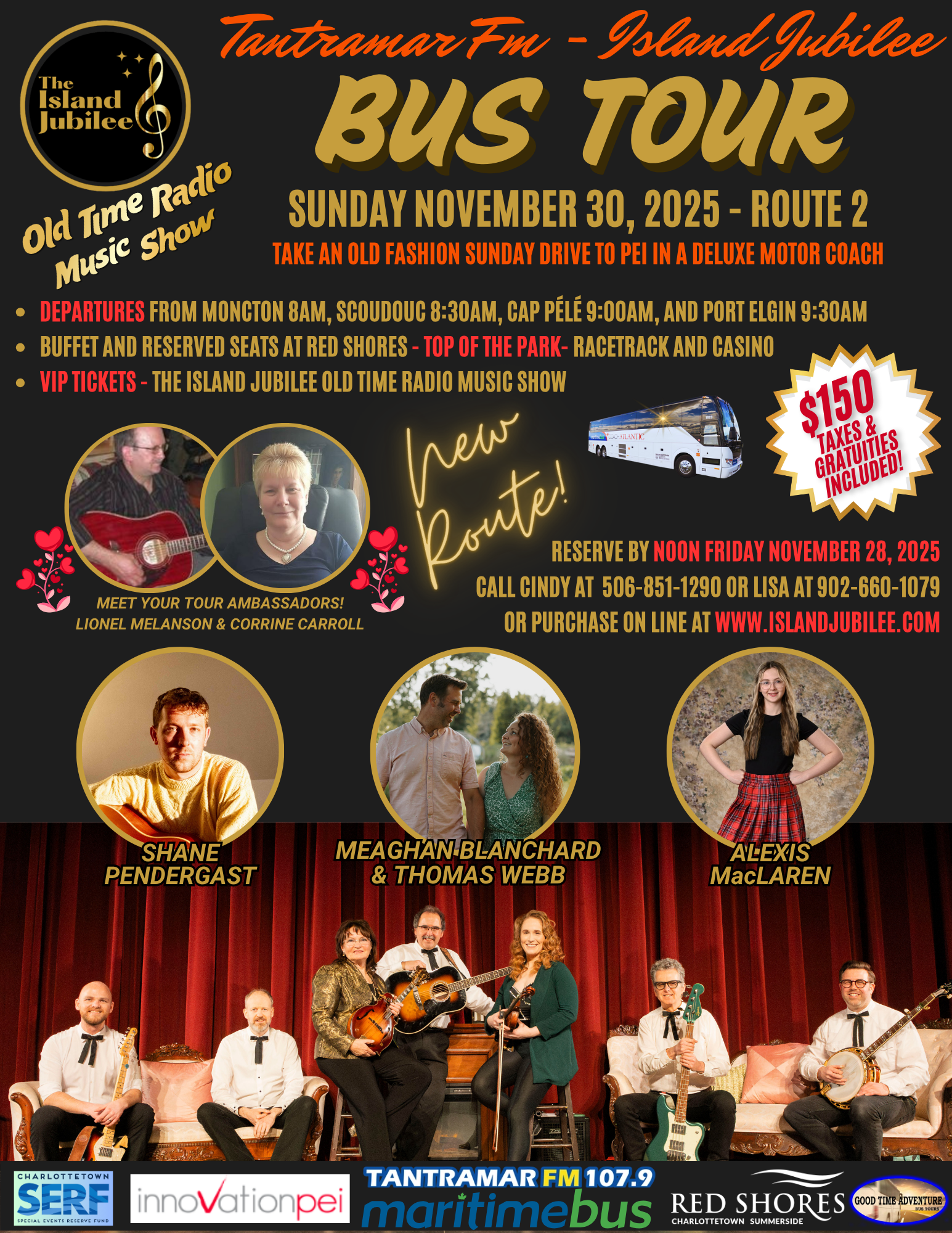 Tantramar FM - Island Jubilee SUNDAY DRIVE Bus Tour: Route 2 - Acadian Trail Departing Moncton to Charlottetown PEI - Day Charter - Sunday NOVEMBER 30, 2025