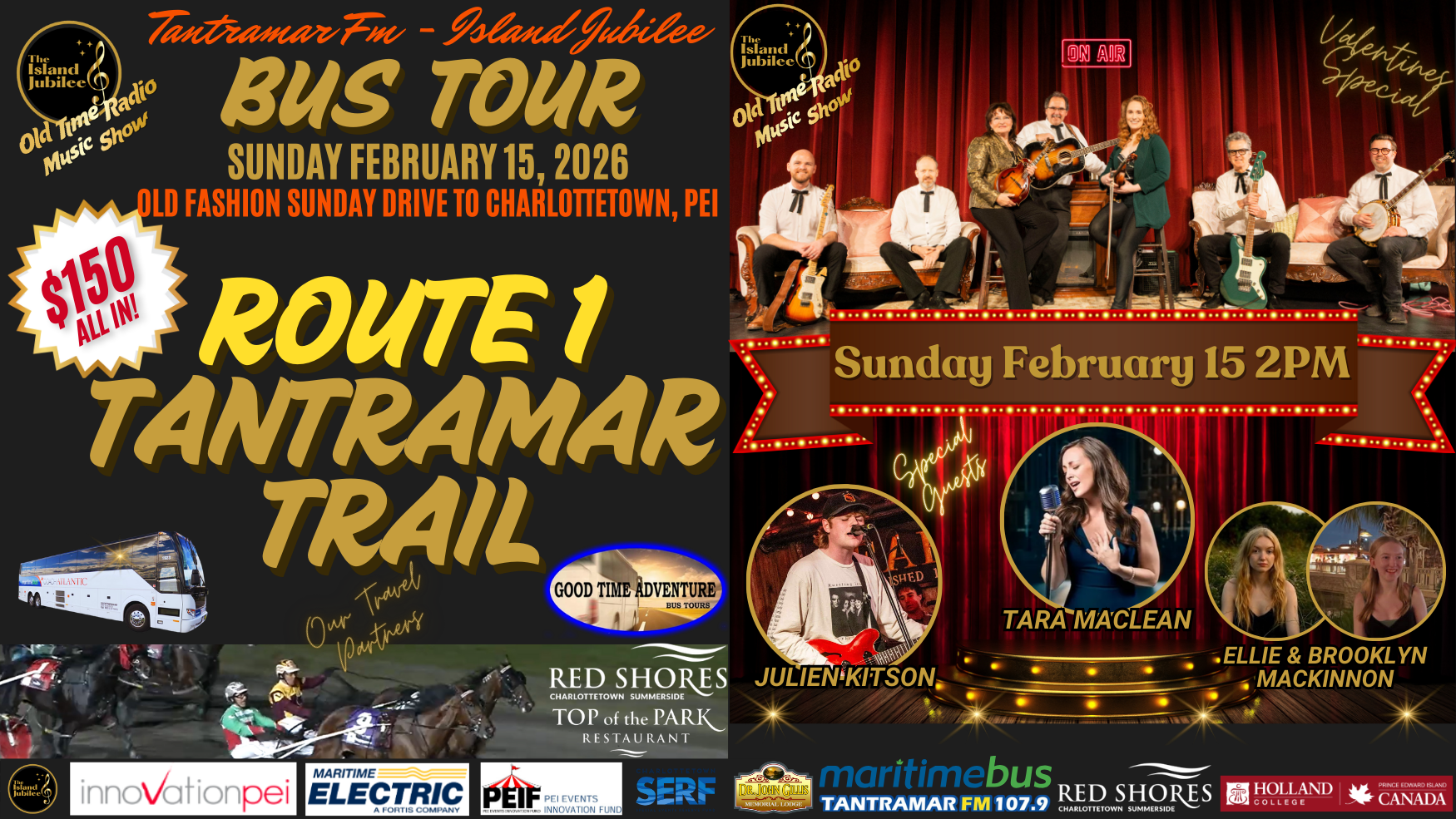 Tantramar FM - Island Jubilee SUNDAY DRIVE Bus Tour: Route 1 Tantramar Trail Departing Moncton/Amherst to Charlottetown PEI - Day Charter - Sunday February 15 2026